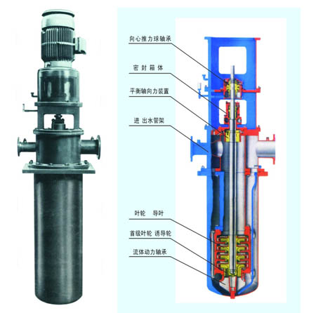 水泵为立式双层壳体结构,单基础安装。首级叶轮为单吸或双吸形式,次级叶轮为单吸形式。水泵吸入口可位于基础之下,也可位于基础层之上,出口在基础之上,二者可呈90°、180°等角度布置。可整体抽出内壳体部分进行维护和检修。